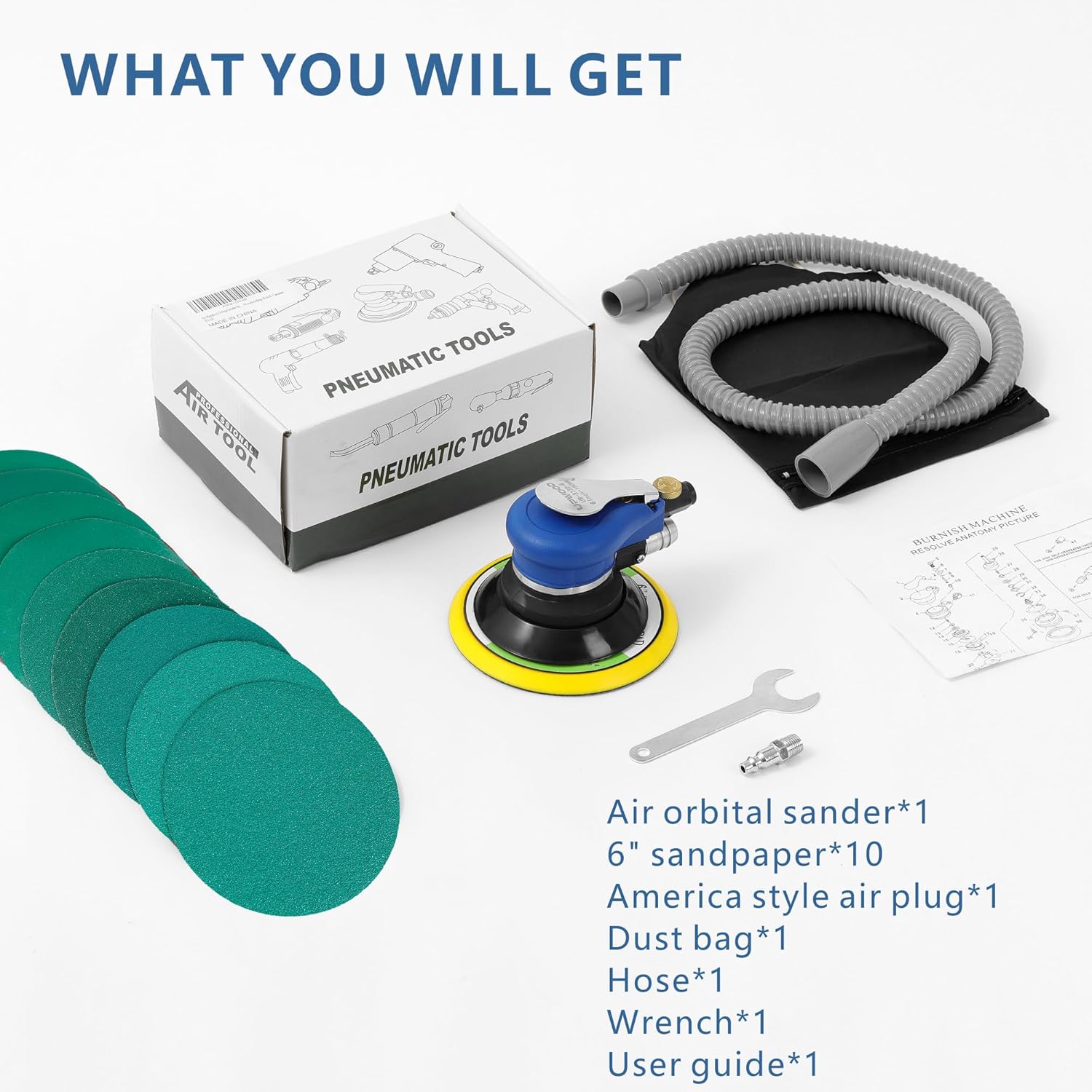 • Come with a 5-inch sander, 10pcs 5-inch 120grit sandpapers, 10pcs sanding wheel