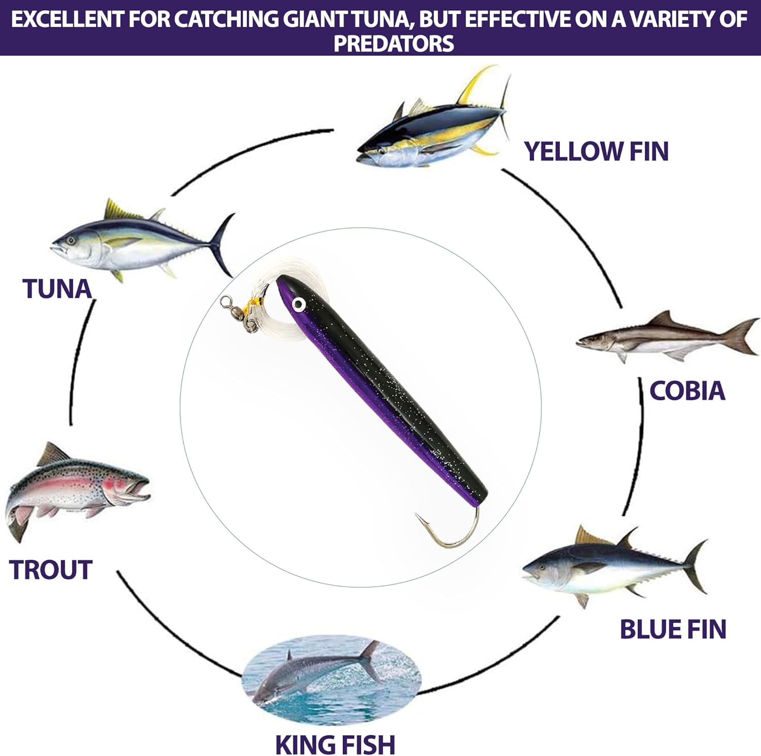The 6" Cedar Fishing Plugs (Purple/Black) - 6 Pcs Rigged Fishing Lures with Sturdy Lure Bag is the ultimate choice for offshore fishing, crafted specifically for targeting big game species like tuna, dorado, marlin, and wahoo. This set includes six premium-quality, cedar plug lures rigged and ready for offshore trolling, with each plug designed to deliver a lifelike swimming motion that triggers strikes from saltwater predators. Built from durable cedar wood and equipped with Mustad hooks, these lures are engineered for high performance and long-lasting use, withstanding the toughest saltwater conditions. Accompanied by a saltwater-resistant lure bag, this set keeps your gear organized and ready for any fishing adventure. Whether you're an experienced angler or new to saltwater fishing, these versatile tuna trolling lures provide reliable action to enhance your catch rate, making them a must-have for every fishing gear collection.