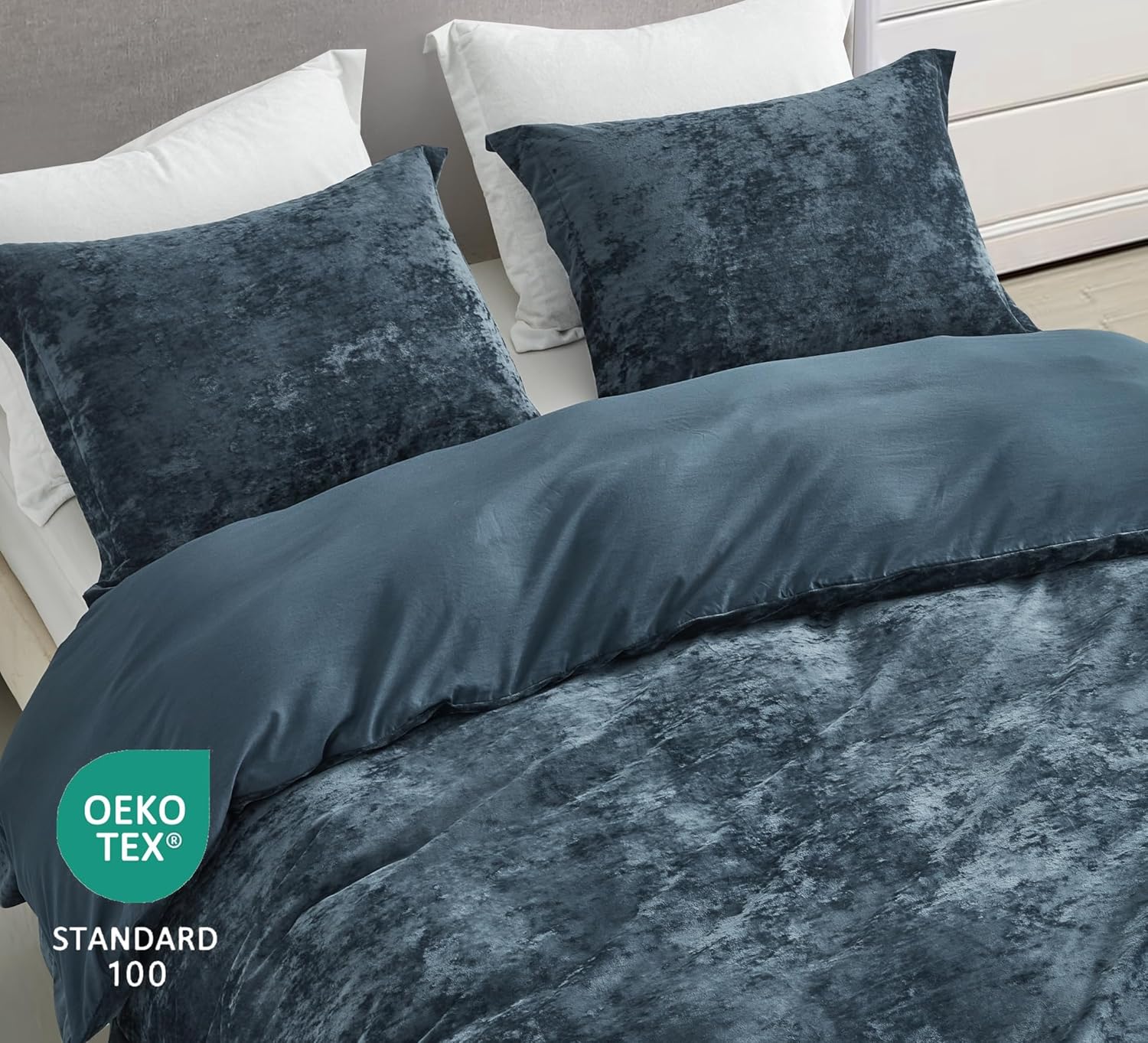 Elevate your bedding experience with the Chezmoi Collection 3-Piece Distressed Velvet Duvet Cover Set with elegance. Made from ultra-soft 100% polyester, this set brings rich texture and a lustrous sheen to your bedroom décor. The distressed velvet finish adds dimension and luxury, while the lightweight construction ensures year-round comfort. Designed for both style and functionality, the duvet cover features 8 internal corner and side ties to keep your comforter/duvet insert perfectly in place, and a discreet button closure for easy access. A reversible brushed microfiber for a soft touch no matter which side is being used. The matching pillow shams complete the look with a cohesive, high-end appearance. Whether you're updating your master suite, styling a guest room, or gifting someone special, this set delivers effortless elegance with practical ease. Machine washable for everyday convenience, it's the perfect fusion of fashion and function. Transform your sleeping space into a luxurious retreat with our Distressed Velvet Duvet Cover Set. The perfect blend of sophistication and comfort, this set will add a touch of elegance and warmth to your bedroom.