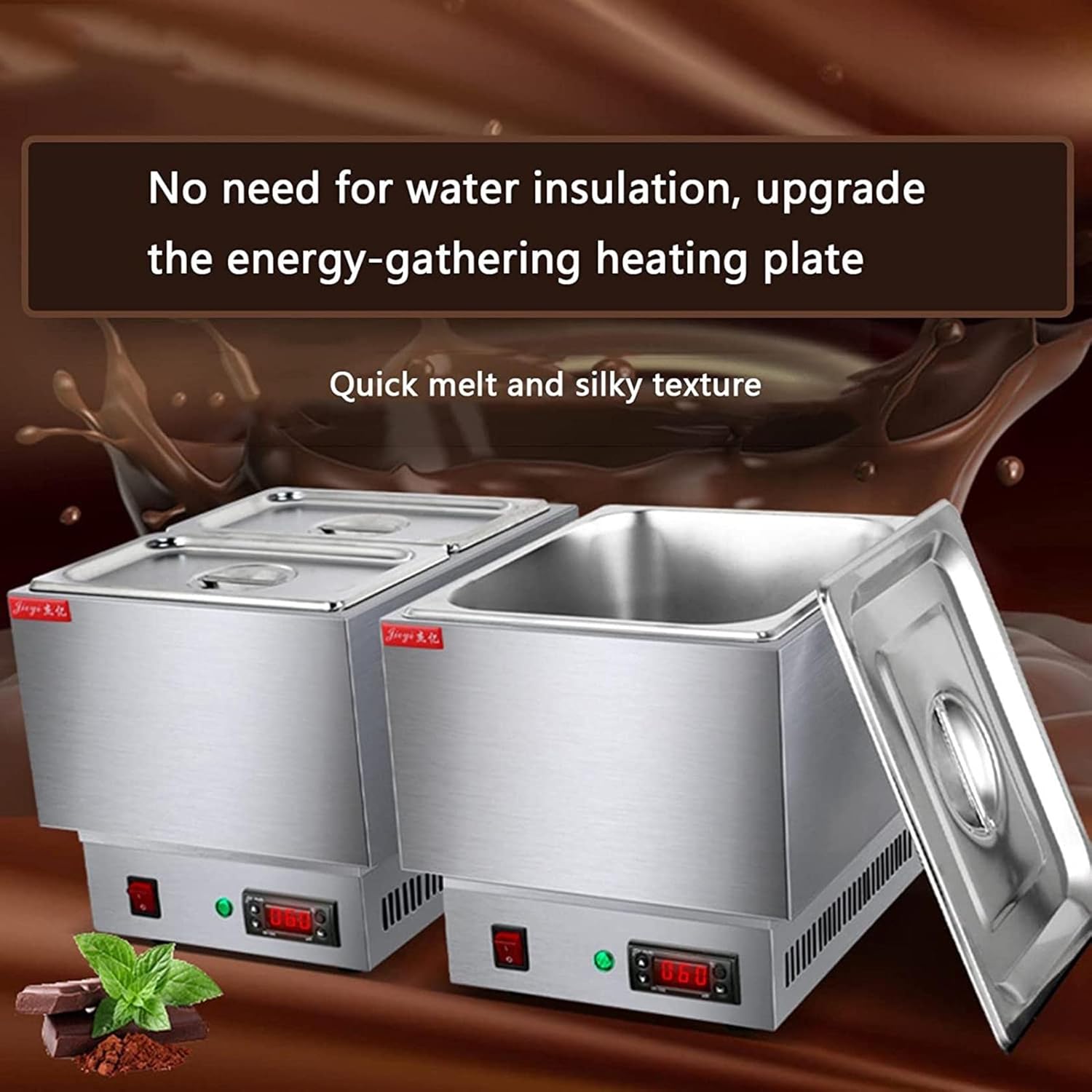 Our electric chocolate melters also can be used as a food heater. Chocolate tempering machine is made of 304 stainless steel, it is rust-resistant, heat-resistant, safe to health, and easy to clean. Great for heating and melting chocolate, cream, milk, handmade candles, handmade soap, beauty wax, etc.Specification: product name: Chocolate Melting Pot Material: Stainless steel Rated voltage: 220V/50Hz Rated power: 250W Number of pots: A-1, B-2 Product size: 28.5*34.5*29.5cm Material tank size: A-27*33*15cm (6.7*13*6 inch), B-16.5*26.5*15.5cm (6.5*10.4*6.2 inch) Temperature control range: 0~110°CProducts include: 1*Chocolate Melting Pot