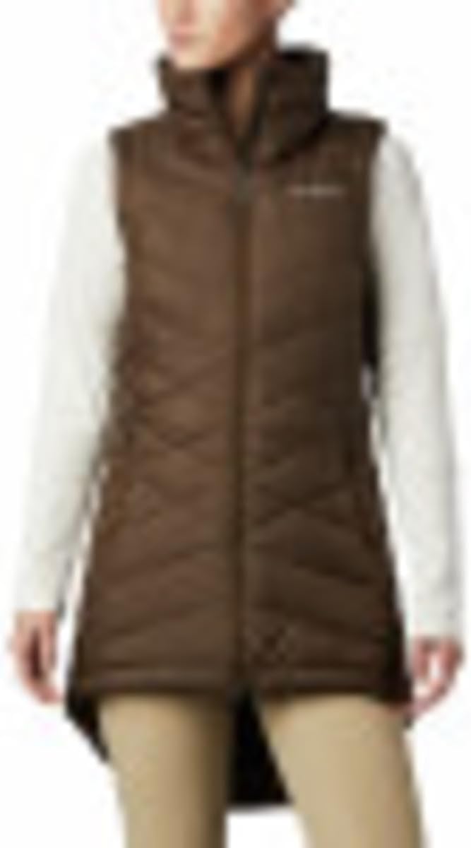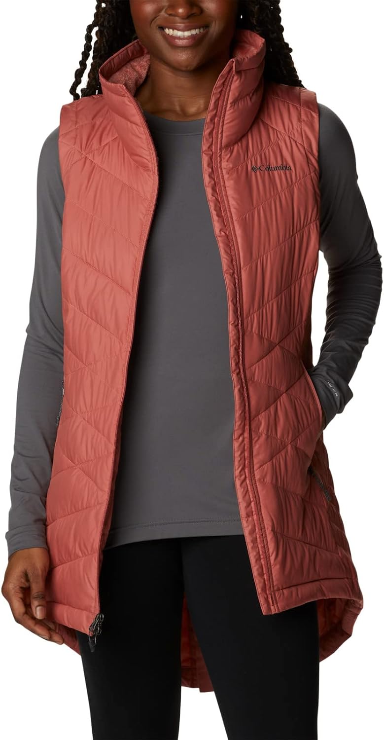 The Columbia Heavenly Long Vest combines stylish urban looks with technology to keep her warm and dry. Made for girls, this great fall and winter jacket features a long silhouette with a modern fit. Crafted from a water resistant shell, packed with 100% synthetic insulation, and lined with our signature Omni-HEAT thermal reflective lining. Combine all that with a yummy plush fleece lined collar and you'll find warm confidence when the weather turns super chilly. You’ll appreciate the two-way main front zipper that provides up/down options for flexibility of movement and warmth control when needed. The interior security pocket and zippered side pockets keep small items secure (including hands) when it’s extra cold, while the water resistant fabric keeps you protected during unexpected rain. This long cozy winter vest is offered in multiple colors and sizes. Active Fit. To ensure the size you choose is right, utilize our sizing chart and the following measurement instructions: For the chest, measure at the fullest part of the chest, under the armpits and over the shoulder blades, keeping the tape measure firm and level.