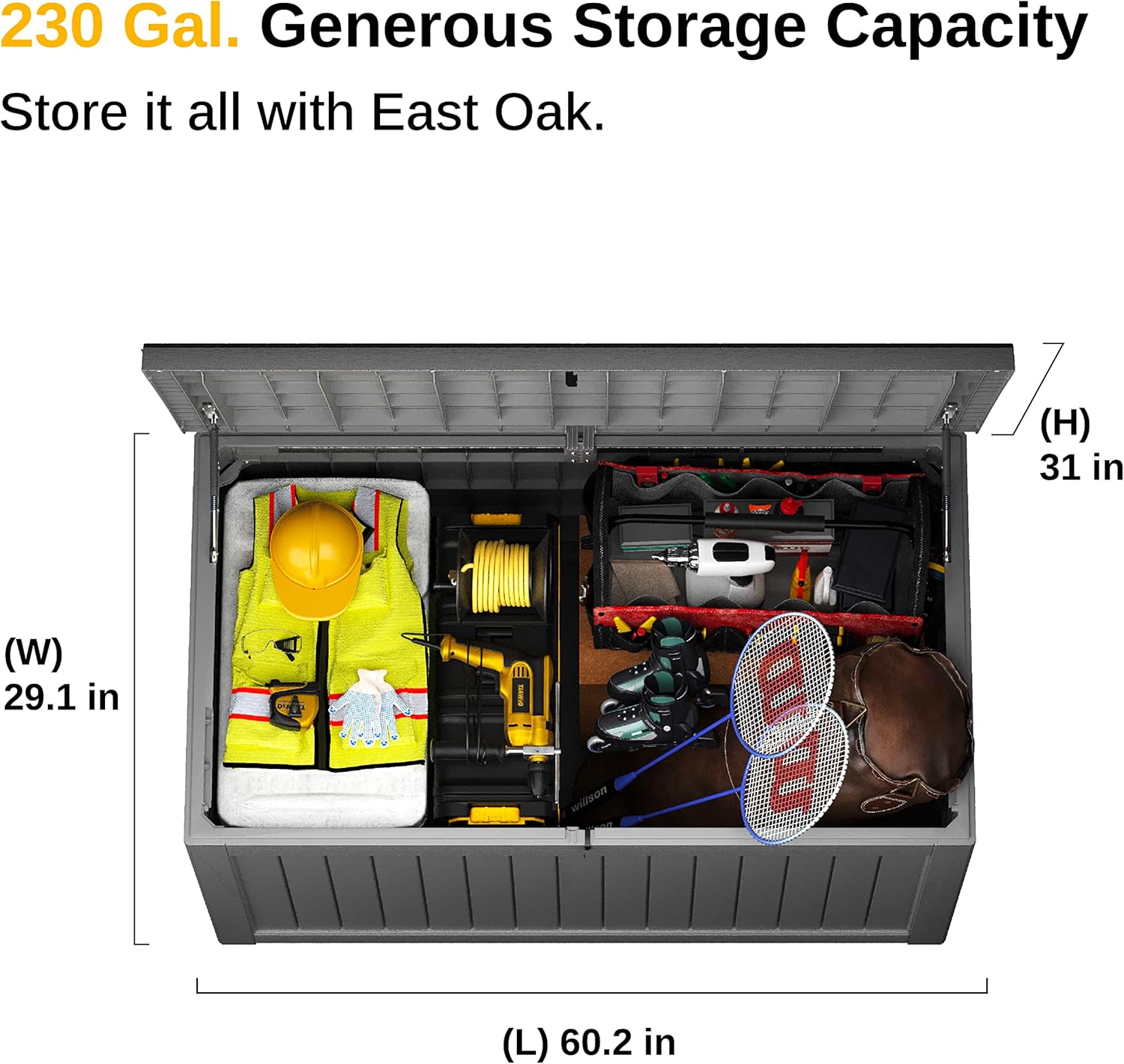 EAST OAKโs vision is to be the worldโs premier innovator and producer of high-quality and affordable tech-enabled outdoor lifestyle products.EAST OAK's deck boxes offer different sizes of storage space for your outdoor life. They provide enough space for outdoor cushions, pool supplies and more. These outdoor storage boxes are made of durable resin and have excellent water resistance as well as UV protection.PRODUCT INFO:Material: Upgraded resin materialFunction: Waterproof, Fadeproof and LockableCapacity: 31 gallon (117.35L)UV Resistant: UV Resistant 1000+hrsOuter Product Size (LxWxH)๏ผ22.8"L x17.1"W x20.86"HInner Dimensions (LxWxH)๏ผ20.91"L x14.13"W x19.72"HEasy to assemble and clear instructionCustomer Support: 3 Years.
