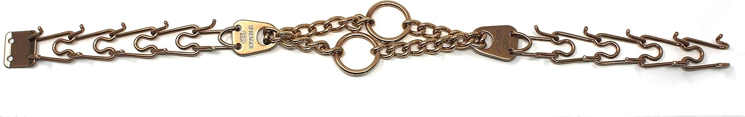 The Herm Sprenger Curogan Prong collar is one of the most recognizable and popular names in obedience training tools. A safe and effective alternative to choker collars, it puts even pressure around the neck, about every half inch, pinching the skin in a band. This collar does not apply direct pressure to the trachea, so you can train your dog with little or no tugging, jerking, or pulling. The addition of a center plate connector allows the middle link to be configured symmetrically, enabling the prongs to tighten in the same direction. Made of high quality Curogan (Copper and Tin allow). Curogan is completely Nickel free, which makes it a perfect choice for dogs who are allergic to nickel. The size of this collar can be adjusted by adding or removing the links individually. Features: interlocking links, each link equipped with two blunt prongs slips over dog's head for easy on, easy off slightly beveled prong tips easy to increase or decrease in size. Additional links sold separately. Sizing instructions: collar should fit snuggly just below the dog's ears, measure the circumference of dog's neck and add 3 inches.