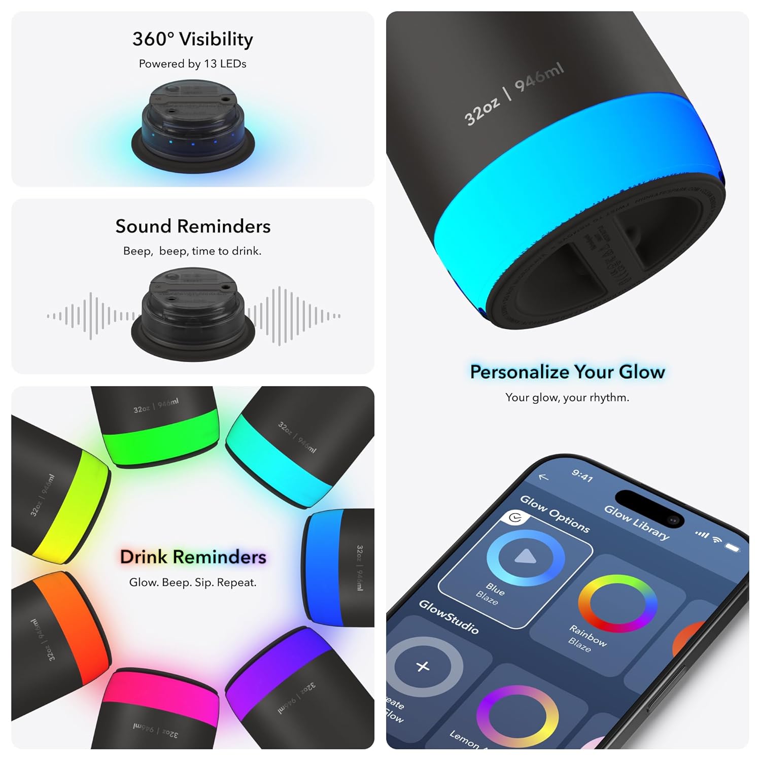 | Additional product features | Apple Find My Capability, Bluetooth Syncing to Free App, Hydration Reminders (Glow, Sound, App notifications), Rechargeable Sensor (USB-C up to 21 days per charge), Water Tracker |