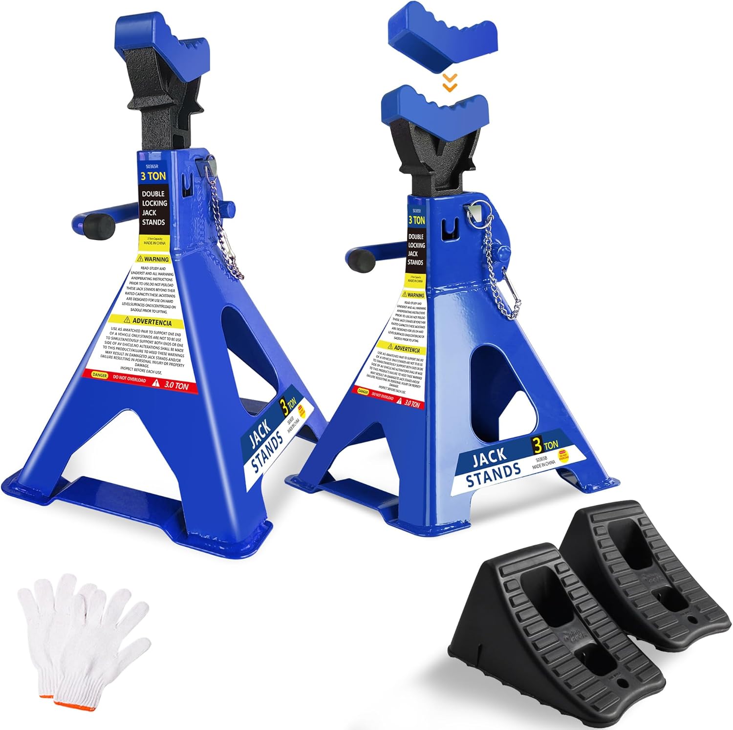 Jack Stands 3 Ton, Extra Tall Heavy Duty Car Jack Stand, 11.4-16.7 inch Adjustable Height for Lifted Truck, SUV, MPV and ATV, with Rubber Cap and Safety Pin, with tire repair kit Worklight Wheel chock
