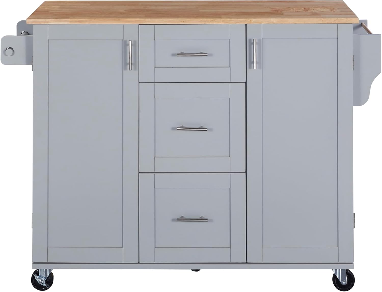 Large Storage SpaceThis 43" D kitchen island is meticulously designed to optimize functionality and organization in your culinary space. Boasting three drawers and two slide-out shelves, it offers abundant storage capacity for all your essential items. Bid farewell to a cluttered countertop as this cart ensures meticulous placement of everything, while also providing additional room for pots, pans, utensils, small appliances, and pantry necessities.Superior QualityCrafted from high-quality MDF and smooth rubber wood, this kitchen cart with storage offers exceptional stability and durability, ensuring long-lasting performance.Mobile&StationaryOur kitchen island on wheels is designed with 5 360-degree wheels, including two locking wheels to meet your desire to move everywhere smoothly and stabilize. Additionally, we offer five sturdy solid wood cabinet feet as an alternative option if you prefer a stationary cabinet setup.Internal Storage RacksThis rolling kitchen island features an internal storage rack design inspired by the functionality of refrigerator doors. These racks effectively optimize storage capacity while occupying minimal space, making them an ideal addition to kitchens, dormitories, offices, bedrooms, and dining areas.Product SpecificationsProduct Dimension(Overall)50 x 17.00 x 36.85 inchesProduct Weight109.45LBSTabletop Weight Capacity220LBSDrawer Weight Capacity75LBSProduct Care1. Wipe with a soft dry cloth. Avoid the use of harsh chemicals and household cleaners as they may damage the finish.2. Hardware may loosen over time; periodically check that all connections are tight.Estimated Time to Assemble40-60 minutes
