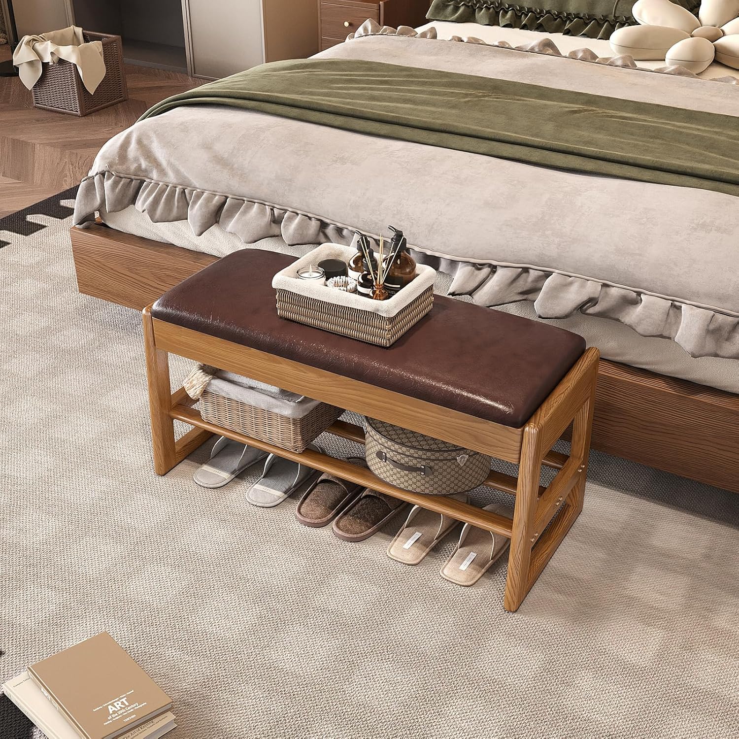 Shoe Rack Bench with Cotton-Linen Cushion 2-Tier Wooden Storage Bench 550lbs Compact Simple & Modern Design for Entryway, Hallway, Bedroom, Living Room, Closet, Front Door Entrance, Foyer