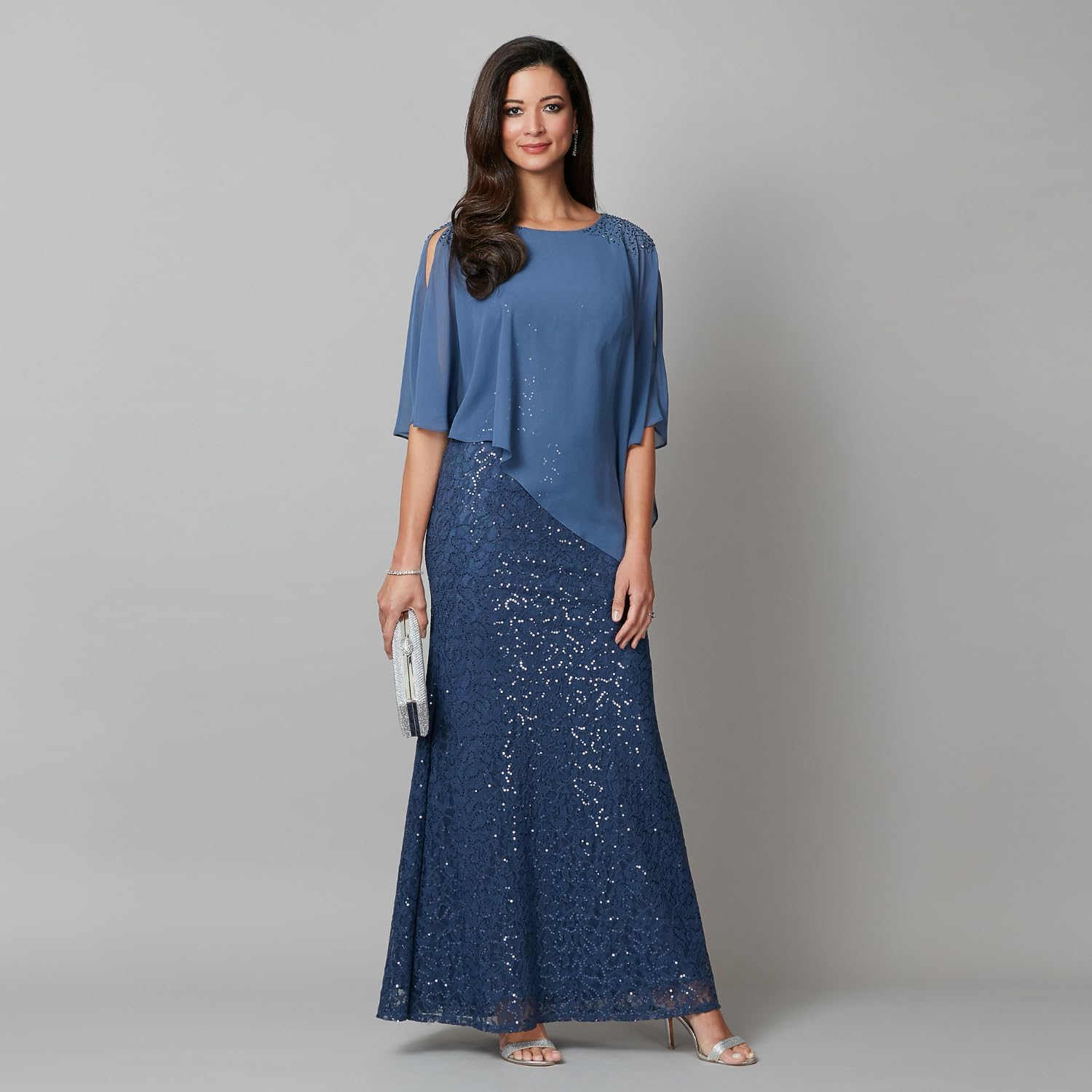 The S.L. Fashions Women's Long Length Sequin Lace Beaded Capelet Dress exudes timeless charm and glamorous allure. This one-piece marvel features a boat neckline and intricate sequined lace, complemented by a chic chiffon overlay and beaded shoulder detail. The attached asymmetrical cape enhances the dress's sophistication, making it perfect for formal evenings and special occasions. Crafted from soft lace and chiffon, this gown offers luxurious comfort with its flared skirt and convenient zipper closure. The floor-length design, combined with the sparkling sequined lace, ensures effortless elegance and sophistication for any event.