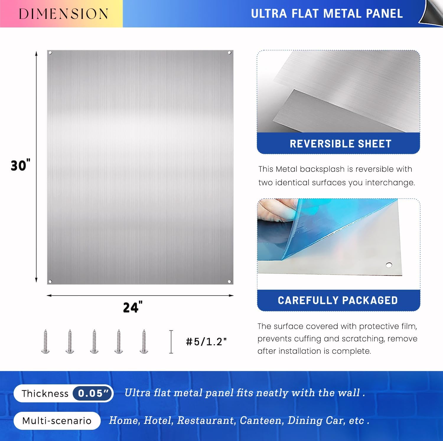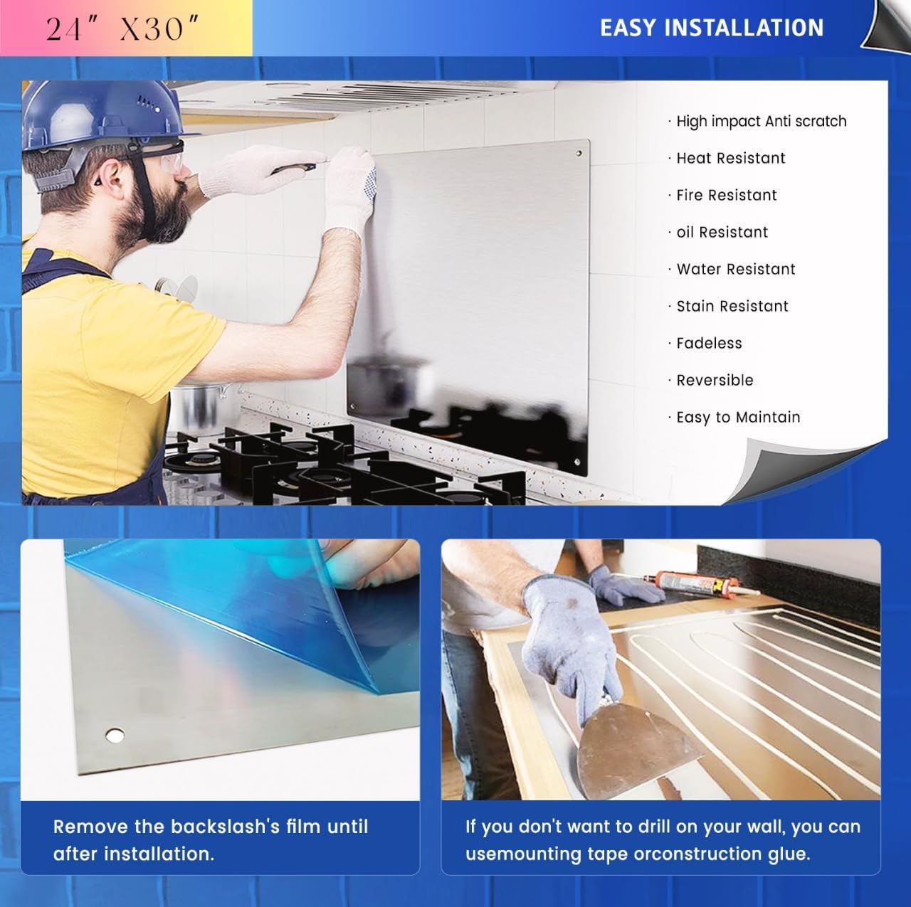304 Stainless Steel Backsplash– 24"x30" – Durable, Easy to Install, and Perfect for Protecting Your Kitchen and Walls Protect your kitchen walls from grease, oil, and water with this high-quality 304 stainless steel backsplash for stove. Made from premium 304 stainless steel, it offers exceptional durability and resistance to corrosion, making it ideal for kitchens, commercial spaces, and high-moisture areas. Whether you're covering your stove, sink, or countertop, this splash guard ensures long-lasting protection and easy maintenance. Key Features: Durable 304 Stainless Steel: The stove backsplash protector for wall is crafted from high-grade 304 stainless steel, ensuring resistance to rust, corrosion, and stains. It’s built to withstand everyday use and high-moisture environments. Perfect Size (24"x30"): With a size of 24 inches by 30 inches, this backsplash behind stove provides ample coverage for most kitchen walls and countertops, protecting against common splashes and stains. Strong 0.7mm Thickness: At 0.7mm thick, the metal backsplash panel is sturdy enough to withstand impacts and daily use while being lightweight for easy installation. Easy Installation: Four pre-drilled holes at each corner allow for quick and secure mounting. The package includes four stainless steel screws for easy installation on any wall. Sleek and Modern Design: T1 adds a stylish touch to your kitchen decor, combining functionality with an elegant appearance. Ideal for Kitchens, Restaurants, and More: Perfect for residential kitchens, commercial cooking spaces, restaurants, and bars, this stove backsplash protector for kitchen wall is an essential addition for areas prone to splashes and spills. Easy to Clean:The smooth stainless steel surface is easy to wipe clean, designed for effortless maintenance, ensuring a cleaner kitchen.