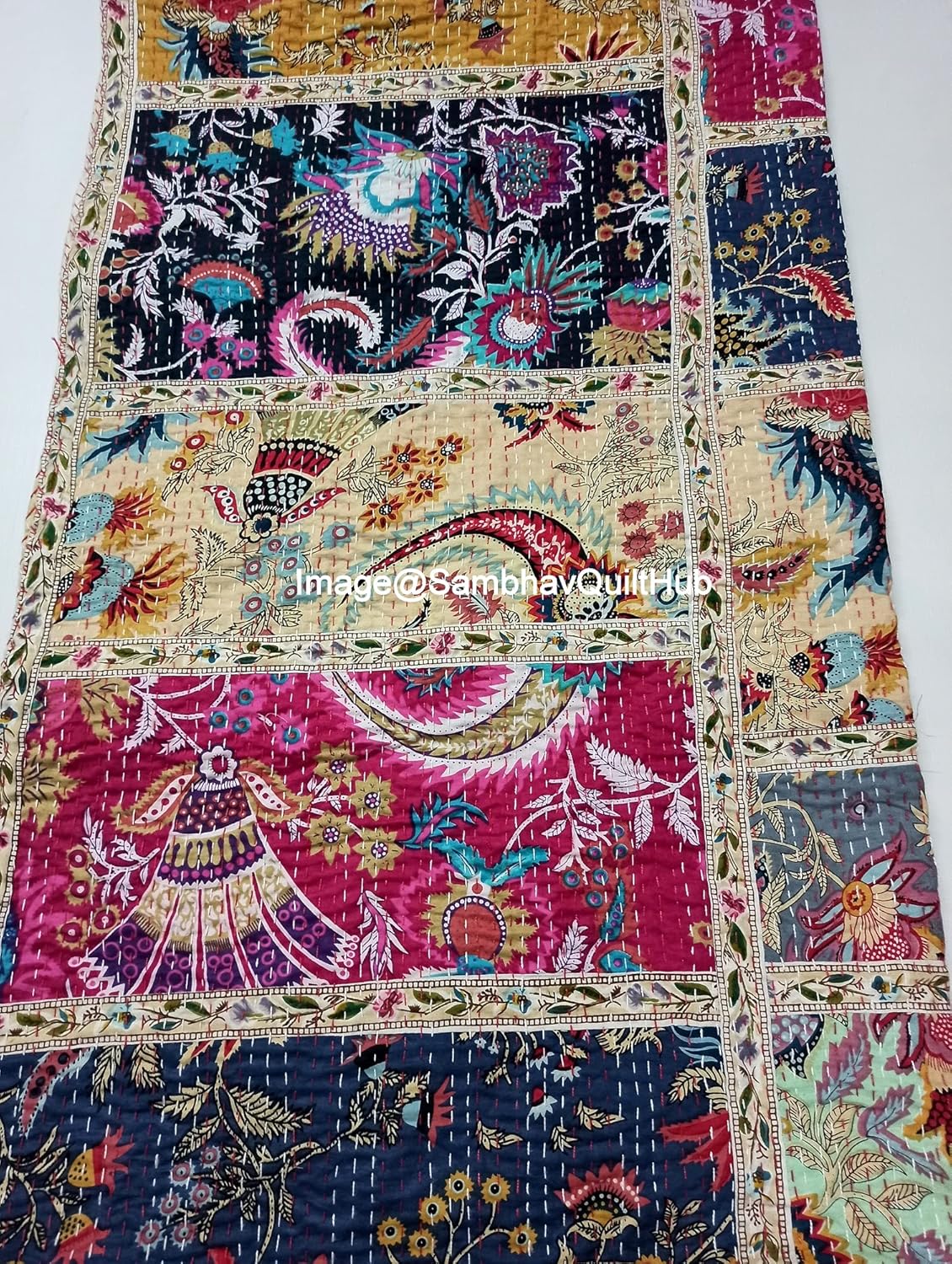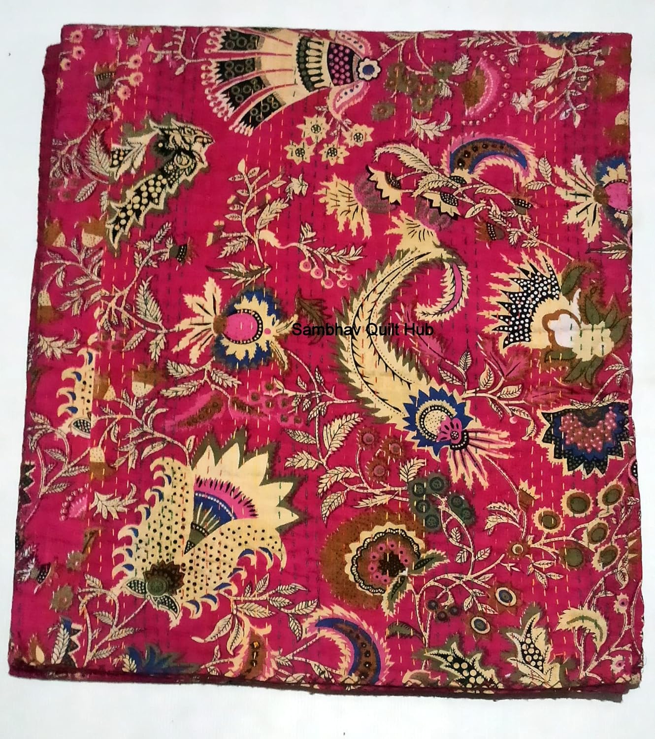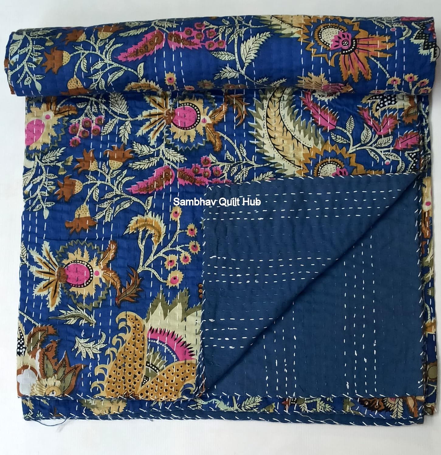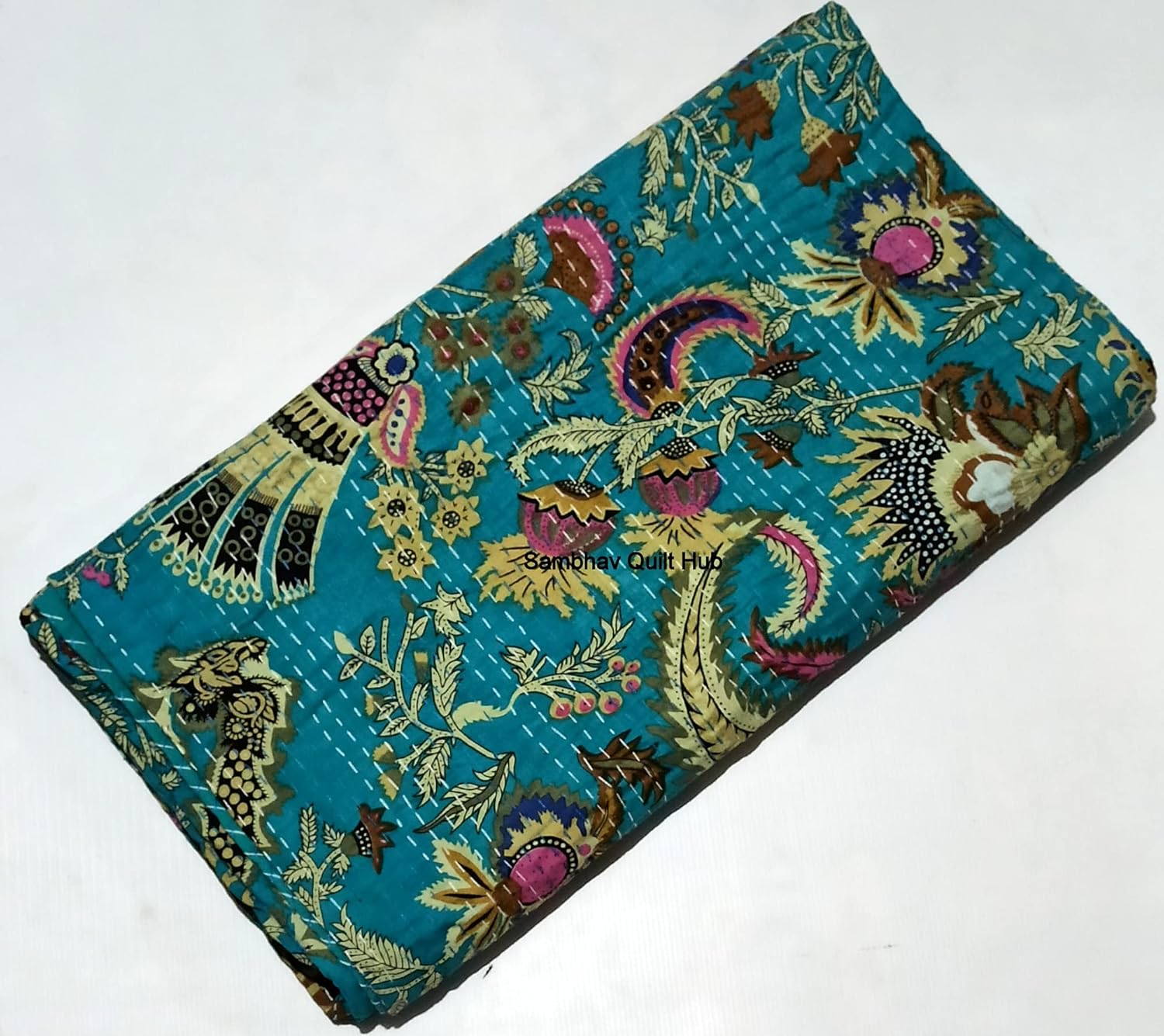 Made with 100% cotton and natural vegetable colors. This piece of art is completely hand stitched by Women artisan in Rajasthan, India. It can make any room alive with its vivid colors, stunning Mukut print and embroidery, made using traditional and famous kantha hand embroidery method. Made from two thin layer of cotton fabric make this piece of art irresistible and also very comfortable. Adding to it's style, this kantha quilt is reversible and both sides can be used. Kantha is still the most popular form of embroidery practiced by rural women.typically use old saris and cloth and layer them with kantha stitch to make a light blanket, throw or bedspread. These cotton lightweight "Quilts" with a beautiful and colorful Mukut design can be used as: 1. Bedspread , Bedding Throw , Blanket Or Quilt 2. A Summer Bed Cover 3. A Throw 4. A Fabulous Picnic Rug 5. Nice Bedroom Quilt, This can fit to a 60 x 90/ 90*108 inch's wide twin size/ King Size bed as blanket or throw or can easily fit as bedspread / bed cover to twin/ King bed . Note: Their might be some negligible size variation of approx 2-3 inches due to handmade, hand washed, hand stitching & performing of Kantha work which is negligible.